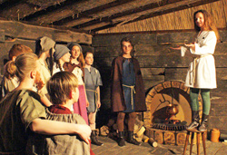 auf ihren Pferden Grim und Fjalar und lernen die Taubenzüchterin